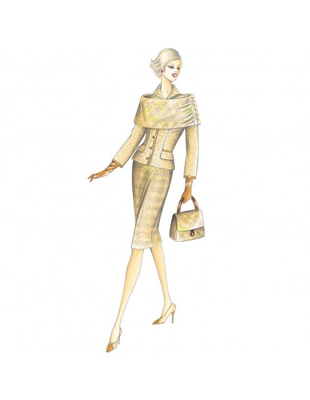 This short, modern jacket has a raised pointed collar and flaps set at the waistline. It is completed with a stole. Suggested fabric: fabric or fur.
