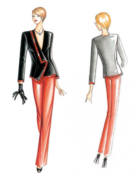 Jacket single lapel and asymmetrical hem, side fastening with two buttons matching the edging.