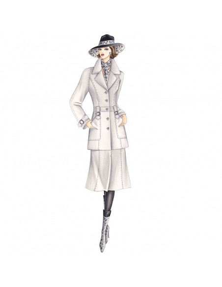 Diese einreihige, figurbetonte Jacke hat einen eingesetzten Gürtel, der mit Schlaufen befestigt und mit einer Schnalle geschlossen wird. Sie hat aufgesetzte Taschen, Halb-Raglanärmel und einen sportlichen Kragen. Empfohlener Stoff: Gabardine, wasserabweisender oder verschmierter Technostoff, Leder oder Wildleder. Rock n. 8438.