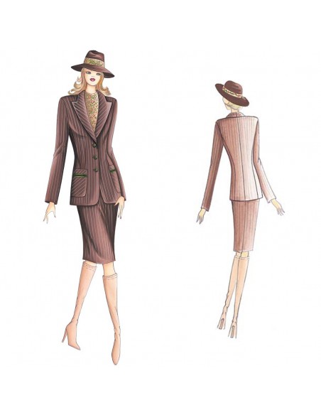 Diese einreihige, figurbetonte Jacke hat aufgesetzte Taschen mit einem mit Leder oder Wildleder besetzten Streifen als Öffnung. Sie hat einen originellen schalartigen Kragen, der zu einem Revers geformt ist. Empfohlener Stoff: Nadelstreifen, leichte Wolle oder Kord.