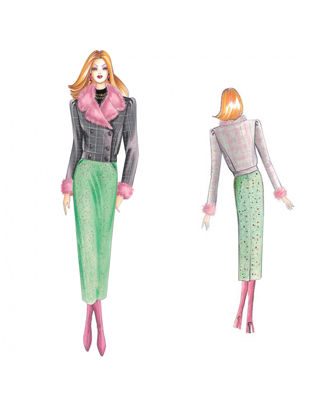 Diese doppelreihige, blusenartige Jacke hat unten ein Streifenband, an den Hüften sind Taschen in den Schnitt eingesetzt. Die Ärmel sind an den Schultern leicht gerafft und der Kragen und die Manschetten sind aus Fell gefertigt. Empfohlener Stoff: leichtes Tartan, Tweed, Vikunja, Denim oder Leder.