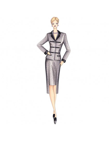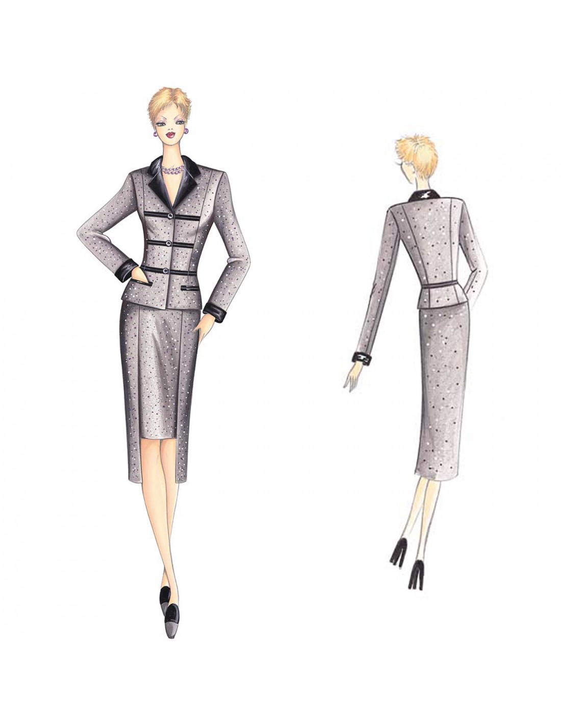 Diese kurze, figurbetonte Jacke hat einen sportlichen Kragen, umgeschlagene Manschetten und eine Baske mit Streifentaschen. Empfohlener Stoff: Tweed, Köpergewebe oder Vikunja mit Lederbesatz. Rock n. 8480.