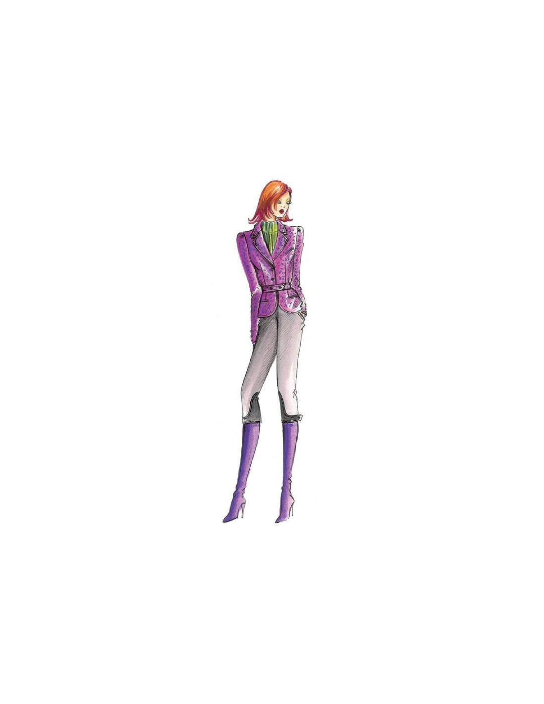 This sporty jacket has a collar with a single strip shaped side secured by a button, waistline with inserted belt and shoulder with two pinch pleats. Suggested fabric: twilled wool or tweed.