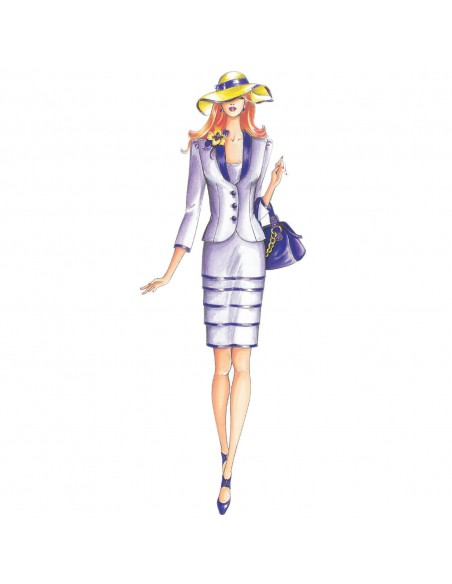 This form-fitting jacket has shawl collar and sleeves gathered at the shoulders. Suggested fabric: shantung, cotton satin or piquet with satin trim.