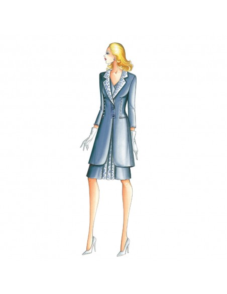 This riding coat has a sporty collar which is one with the placket, welt pockets and darts marked with studs or beads. To be worn with dress n. 2141.