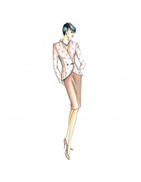 Architektonische Linien für das figurbetonte Redingote-Design, unten abgesetzt mit Doppelkreuzverschluss, abgerundeter Saum und hochgestellter Kragen, der im V-Ausschnitt abfällt. Ausführbar in Damast, Duchesse-Atlas, Faille, Mikrorelief-Matelassè, Mikado.