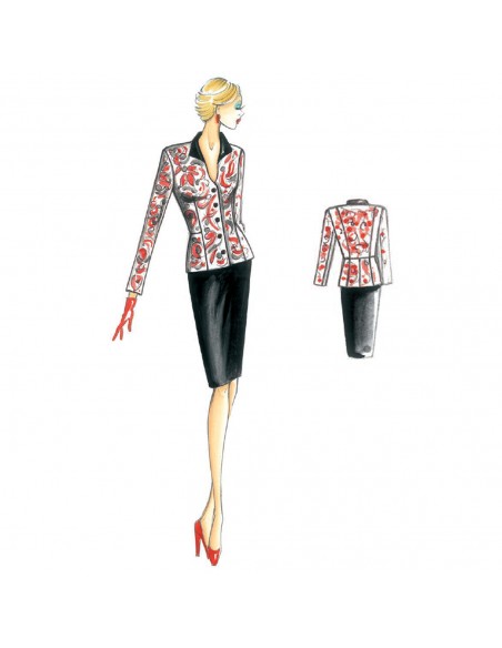 Fitted jacket with stand-up collar that forms an oval opening at the neckline, peplum from the sides, and lace plastron at the back. Suggested fabric: crêpe or printed winter-weight jersey.