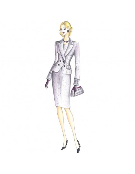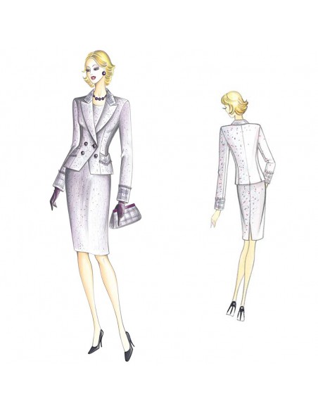 This form-fitting jacket closes with a double crossover and has a V-shaped opening at the bottom. It has original V-shaped patch pockets trimmed with plaid as are the collar and cuffs. Suggested fabric: tweed, vicuna, denim, velvet. Coat n. 1005.
