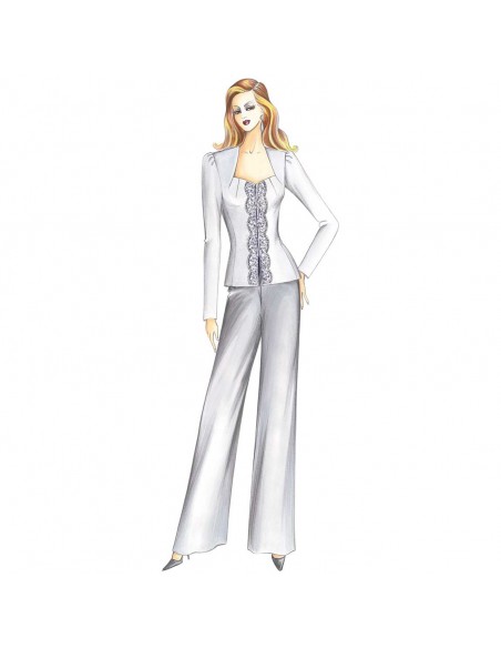 This elegant, tight-fitting jacket has a sweetheart collar, closes with a hook. It has embroidered lace trim and the sleeves have gathered shoulders.