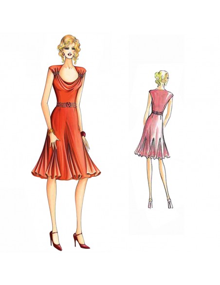 Das Kleid besteht aus einem Mieder mit weichen Drapierungen am Ausschnitt, das mit einem Schmuckverschluss gesichert ist, und einem ausgestellten Rock, in den unten Keile eingesetzt sind. Empfohlener Stoff: Jersey oder Satin.