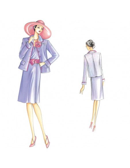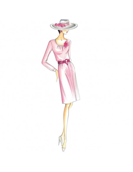 Sanft ausgestelltes Kleid, Mieder mit leichter Rüsche am Hals und Rock mit großer, weicher Seitenfalte. Jacke n. 3002.