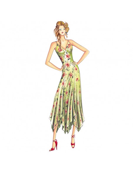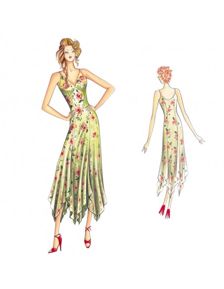 Dieses frische Slip-Kleid hat sechs schräg geschnittene Bahnen mit schalartigem Saum. Die Bahnen sind am unteren Ende getrennt, um mehrere Schlitze zu erzeugen und dem Rock mehr Bewegung zu verleihen. Empfohlener Stoff: Georgette, Jersey, Viskose-Challis.