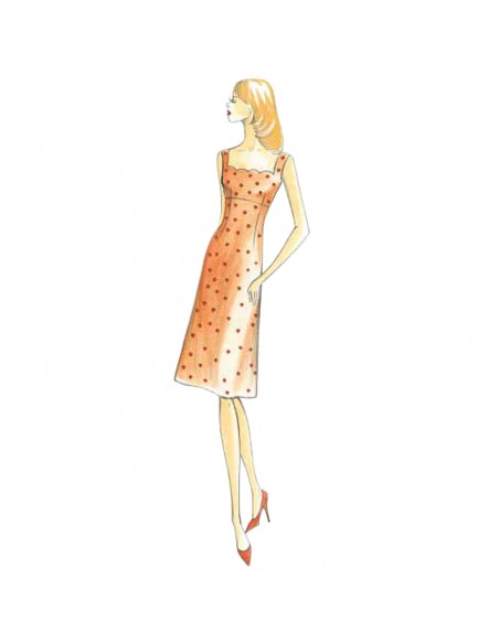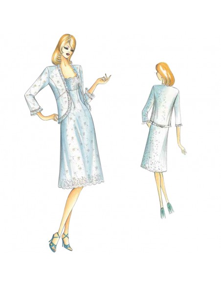 Dieses ausgestellte Kleid hat einen Empire-Schnitt.. Empfohlener Stoff: geöste Spitze. Jacke n. 9846.