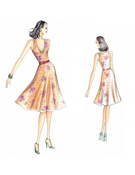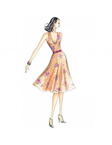 Dieses Kleid im Stil der 1950er Jahre hat ein Mieder mit eingesetzten Armlöchern, einen V-Ausschnitt, der in einer leichten Drapierung endet, eine gegürtete Taille und einen Halbkreisrock.