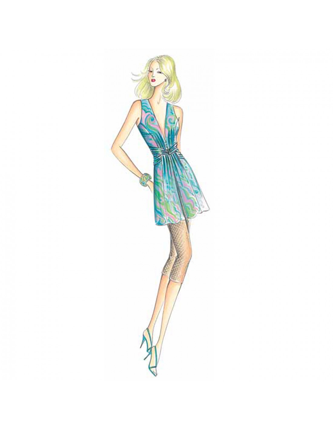 Dieses lange Kleid kann auch als Minikleid mit Leggings getragen werden. Es hat einen Gürtel aus doppelten, zusammenlaufenden Vs, der zwei sanft drapierte Bahnen hält, die sich unten in einen Mittelschlitz öffnen. Empfohlener Stoff: Jersey oder Chiffon.