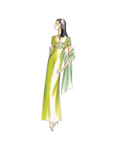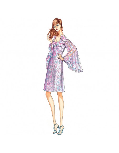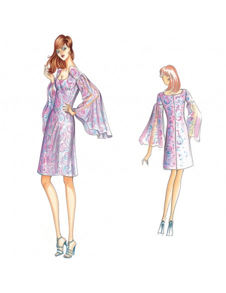 Dieses Kleid ist von den 1970er Jahren inspiriert. Es ist ausgestellt und hat weite, schmetterlingsförmige Ärmel. Empfohlener Stoff: Musselin oder Cady.