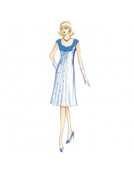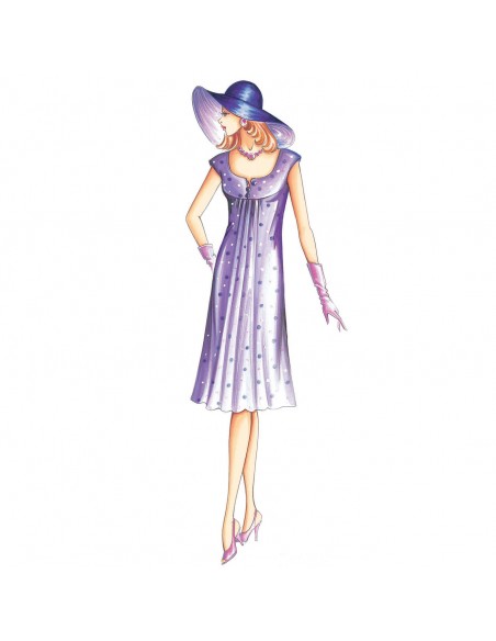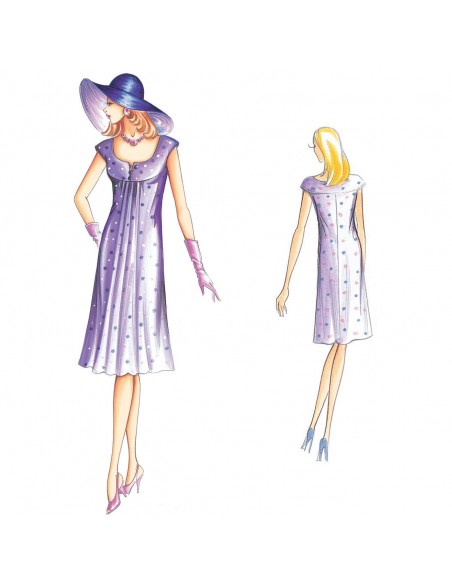Dieses locker sitzende Kleid in A-Linie hat eine Passe, die in die Flügelärmel übergeht. Die Raffungen verleihen dem Rock, der schräg geschnitten ist, Fülle.