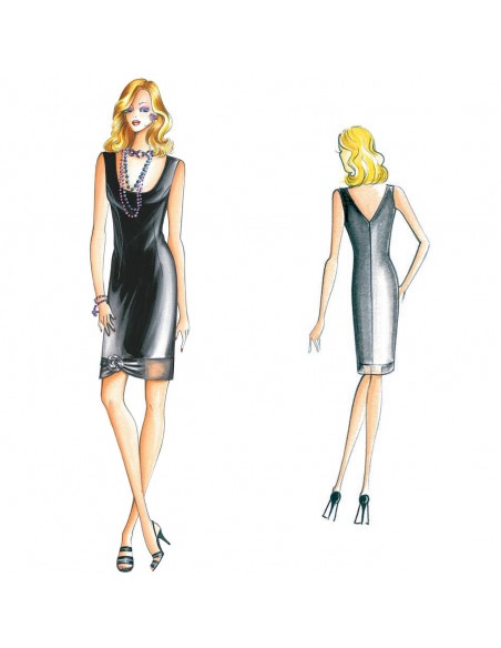 Etuikleid. Empfohlener Stoff: Crêpe de Chine mit Organza-Besatz und passender Stoff-Rosenapplikation.