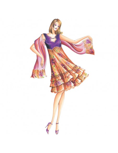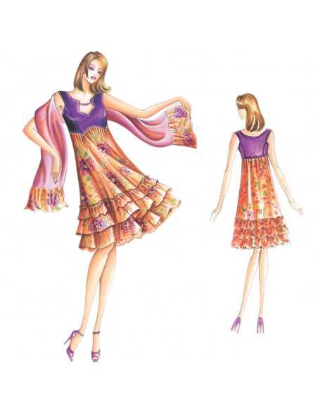 Dieses Kleid hat eine hohe Taille, die die Raffungen im Rock hält. Der Rock ist schräg geschnitten und hat drei Rüschen am unteren Ende. Empfohlener Stoff: Musselin.