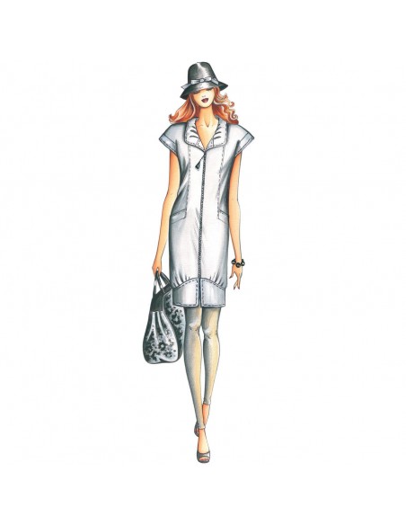 Dieses Tunikakleid hat einen Kragen mit Raffung, Kappenärmel, eingesetzte Taschen und einen hochgezogenen Saum mit Bubikragen. Empfohlener Stoff: Leinen oder Baumwollpopeline.