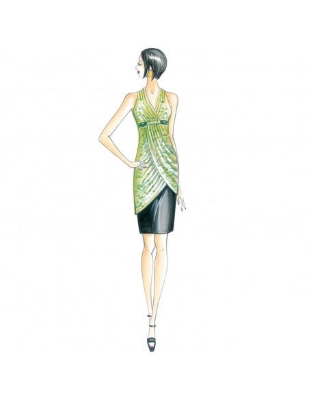 Das Oberteil dieses doppellagigen Kleides ist mit einem drapierten, gekreuzten Paneelmotiv locker gehalten. Die Empire-Taille wird durch ein durchgehendes Band unterstrichen, das Raffungen beibehält. Es hat eingesetzte Armausschnitte und einen V-Ausschnitt. Empfohlener Stoff: bedruckter Jersey mit unifarbenem Unterkleid.