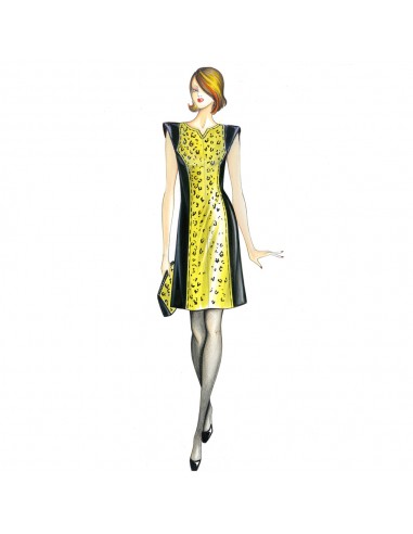 Das Kleid hat ein figurbetontes Oberteil mit kurzen Kimonoärmeln mit dreieckigen Einsätzen, der Rock hat Querschnitte, in die schräg geschnittene Stoffkeile eingesetzt werden. Empfohlener Stoff: Musselin oder Viskose-Crêpe.