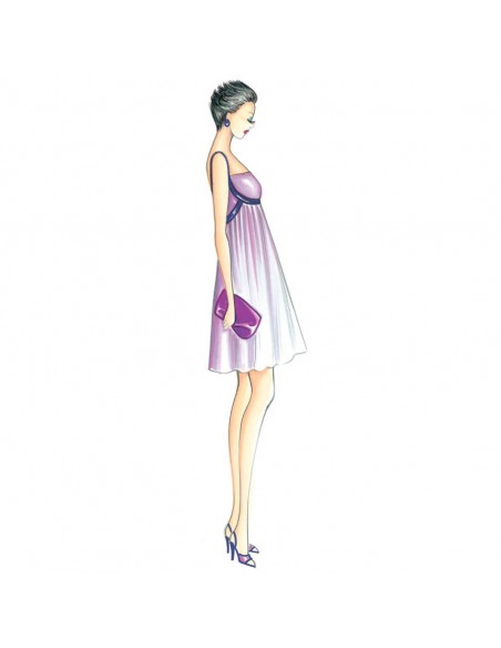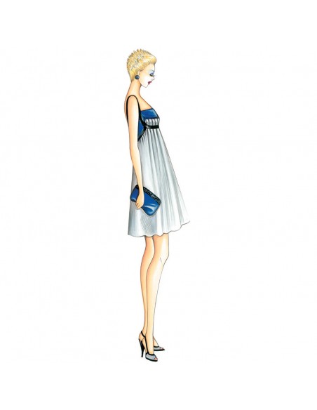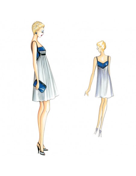 Dieses jugendliche Babypuppenkleid mit Empire-Taille hat einen Saum, der den Rock hält, und ein aufgenähtes, erhöhtes Faltenmotiv. Empfohlener Stoff: einfarbiger oder zweifarbiger Satin.