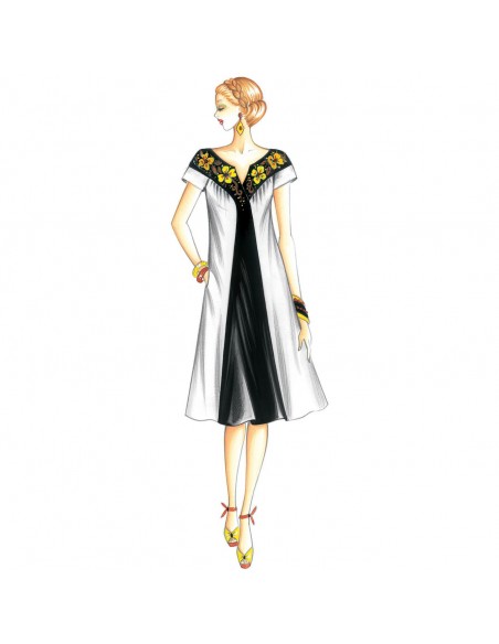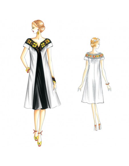 Kleid in A-Linie mit Bootskragen in der Mitte und aufgesetzten Taschen. Empfohlener Stoff: zweifarbiger Satinette oder Baumwolle.