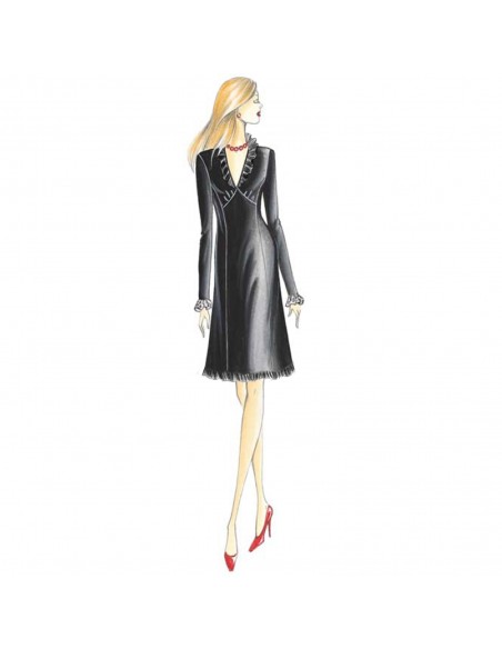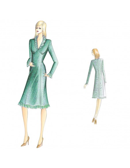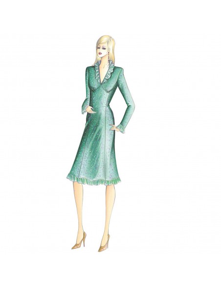 Dieses Mantelkleid ist in sechs Bahnen unterteilt. Es hat eine Empire-Taille, einen V-Ausschnitt und die Manschetten und der Saum sind mit Rüschen verziert. Empfohlener Stoff: einfarbiger oder bedruckter Jersey, Samt, Crêpe oder Tweed mit Spitzen- oder Chiffonrüschen.