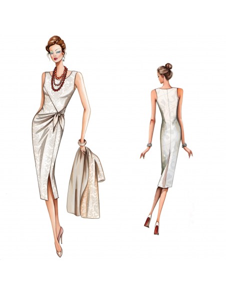 Kleid in halber Passform mit weichem Faltenwurf an der Hüfte, der durch eine Schleife abgeschlossen wird. Jacke n. 8037.