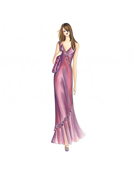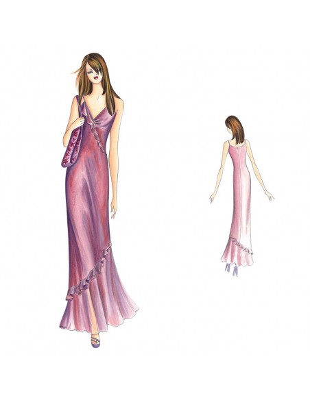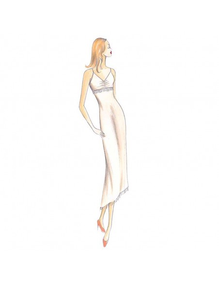 Kleine absteigende Volantrüschen ziehen sich diagonal durch das lange, schräg geschnittene Unterkleid mit leichter Raffung in der Mitte des Halsausschnitts. Außerdem hat es eine breite Volantrüsche am unteren Ende des Rocks. Es kann auch ohne die Volants genäht werden. Empfohlener Stoff: Chiffon, der die Farbe wechselt, Voile oder Charmeuse-Satin.