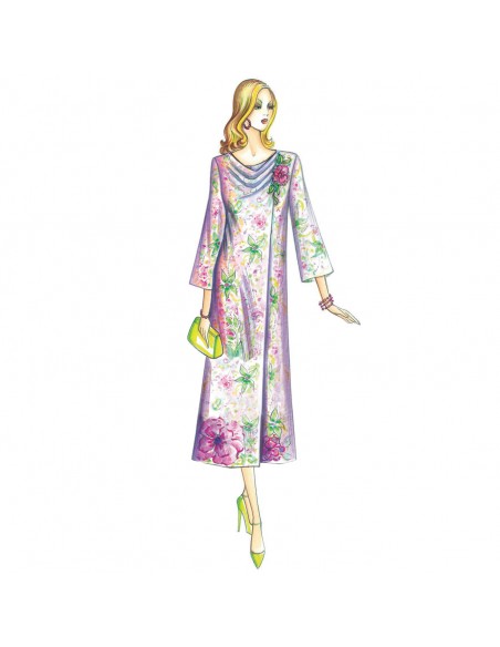 Kleid im Mantel-Stil mit plissiertem Halsausschnitt, Messerfalte an der Seite und leicht ausgestellten Ärmeln. Empfohlener Stoff: Viskose, bedruckter Satin oder Jersey.
