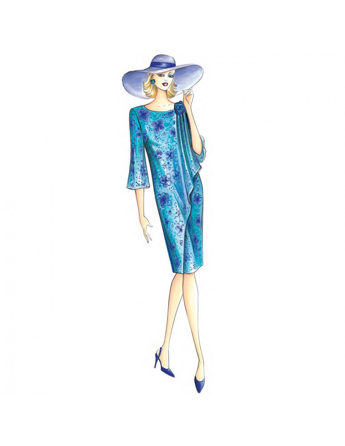Dieses halb taillierte Kleid hat einen asymmetrischen Einsatz auf der Vorder- und Rückseite und leicht ausgestellte ¾-Ärmel. Empfohlener Stoff: Musselin, Georgette, Crêpe de Chine, Satin.