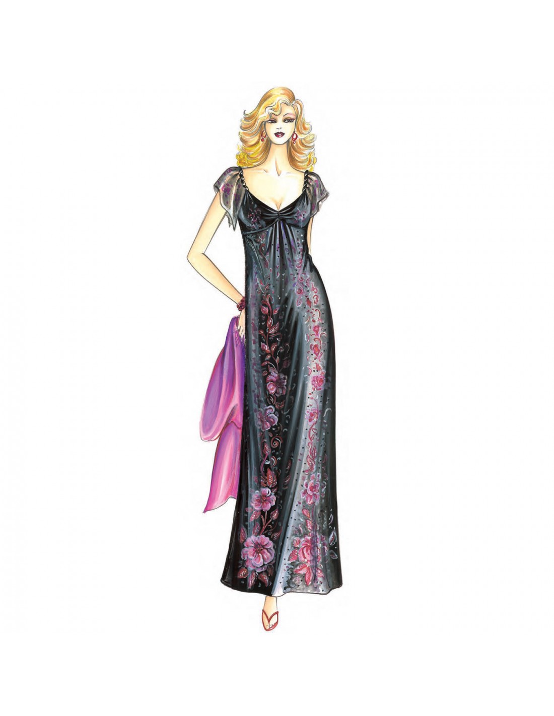 Dieses lange, leicht ausgestellte Kleid ist am Mieder gerafft und hat eine Empire-Taille. Empfohlener Stoff: Musselin, Chiffon, Satin, bestickter Tüll.