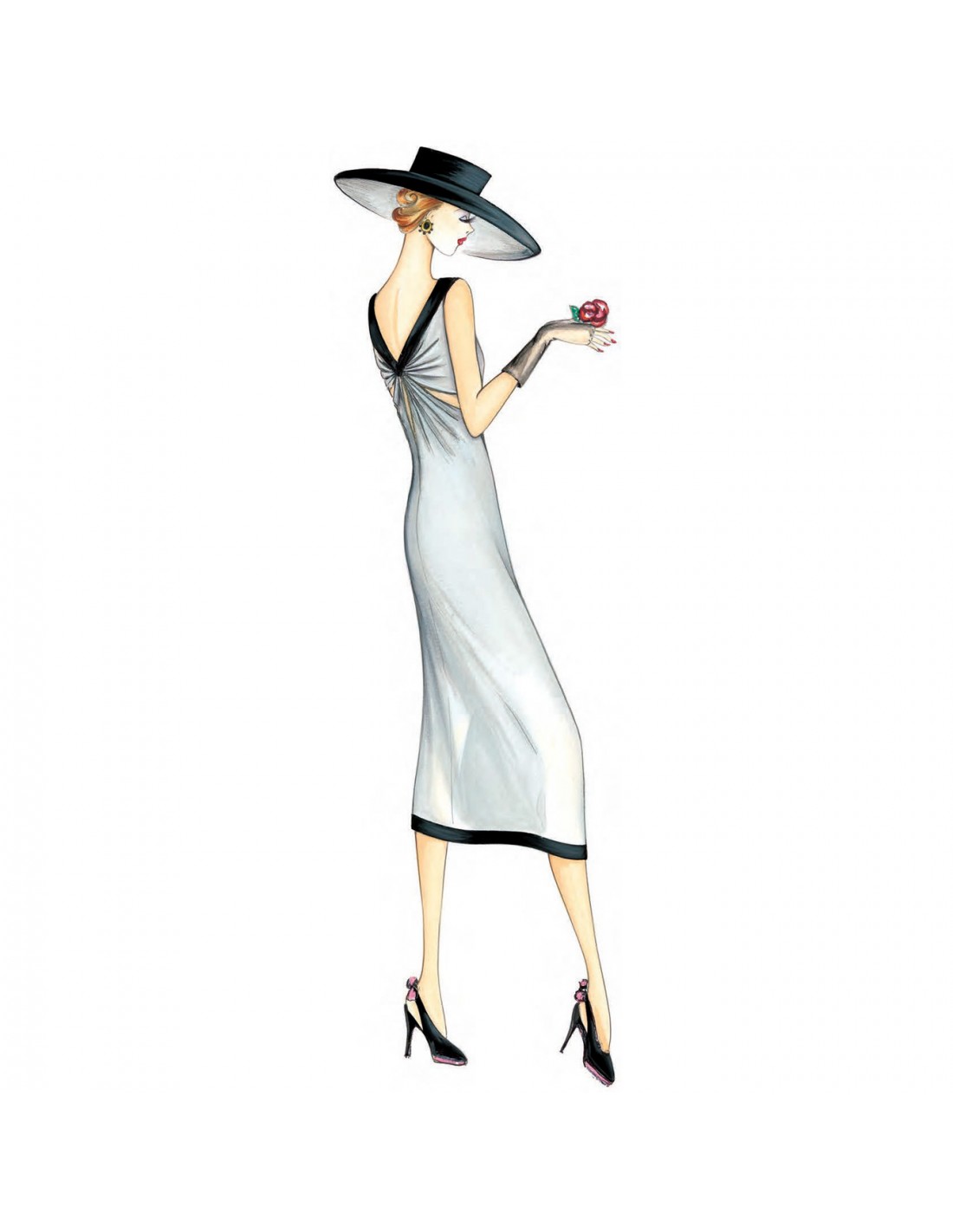 Tailliertes Longuette-Kleid mit Drapierung im Rücken und Seitenschlitz. Empfohlener Stoff: Crêpe, Jersey oder Satin.
