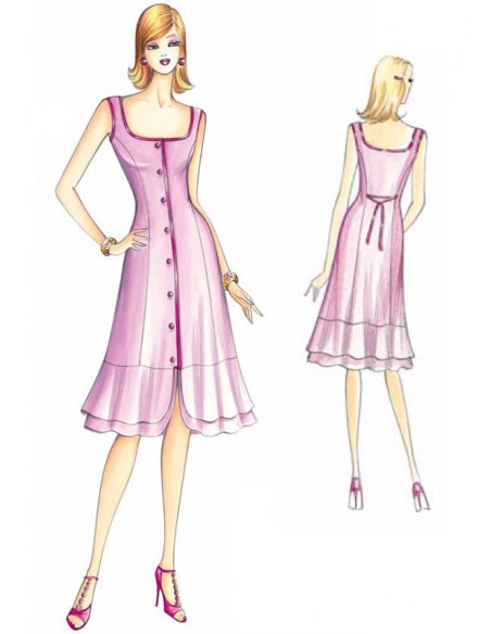 This sunning coat-dress buttons down the front. It has a square neckline and double rounded ruffles at the bottom with central opening. Suggested fabric: georgette, cotton muslin, sateen, eyelet embroidery.