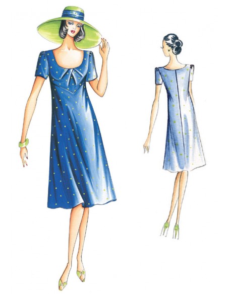 This loose-fitting, A-line dress is made of fabric cut on the bias. The neckline is adorned with soft gathers and the short sleeves are slightly gathered.