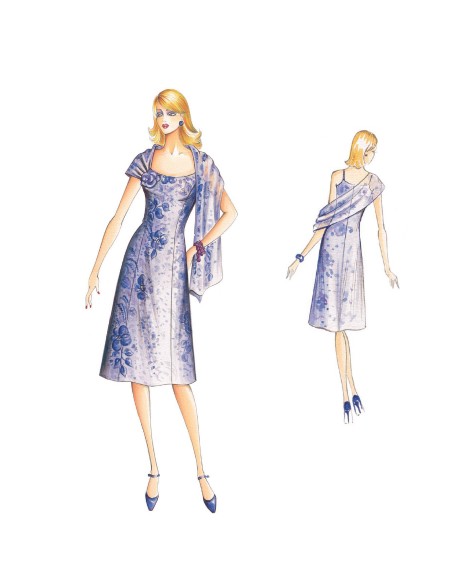 This dress has flared panels, a slip neckline and stole secured at the shoulder by a fabric rose. Can also be made two-tone with a corolla collar.