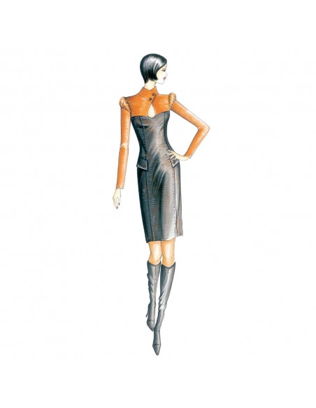 This form-fitting, straight dress has a neckline with yoke that opens into a central teardrop. It has a crossed stand-up collar, glove-like sleeves and gathers at the shoulders. Suggested fabric: twotone jersey or tartan with yoke and sleeves in knit.