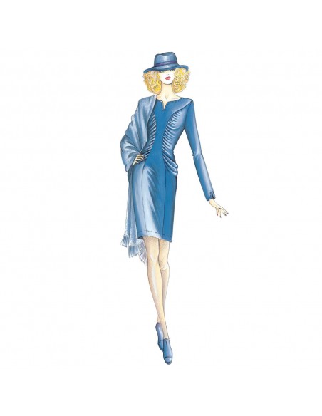 This tight-fitting dress has shaped cuts that hold draping along the bodice. It also has pockets and a boat neckline with central opening. Suggested fabric: jersey.