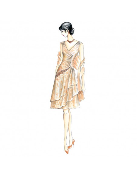 This form-fitting dress has a draped bodice and V neckline. The soft skirt has double panels inserted into the diagonal cut adorned with lace. Suggested fabric: jersey, crêpe de chine, jacquard silk.
