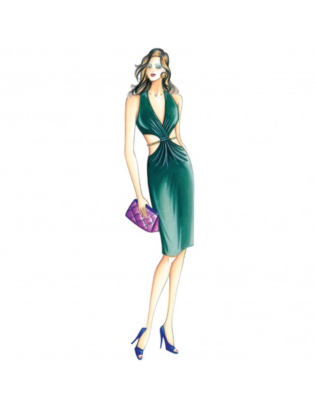 This dress has a porthole cut-out opening, chain marking the waistline, bodice and skirt with crossed draping.