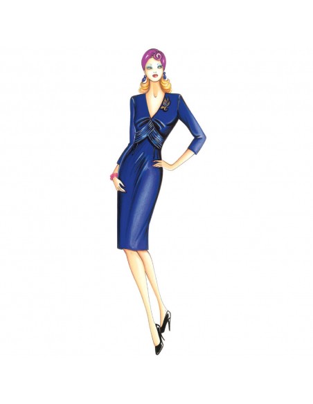 This gown has a V-neckline and gathers at the center of the bodice, the raised waistline is marked by a draped waistband. Suggested fabric: satin on velvet and crêpe-satin.