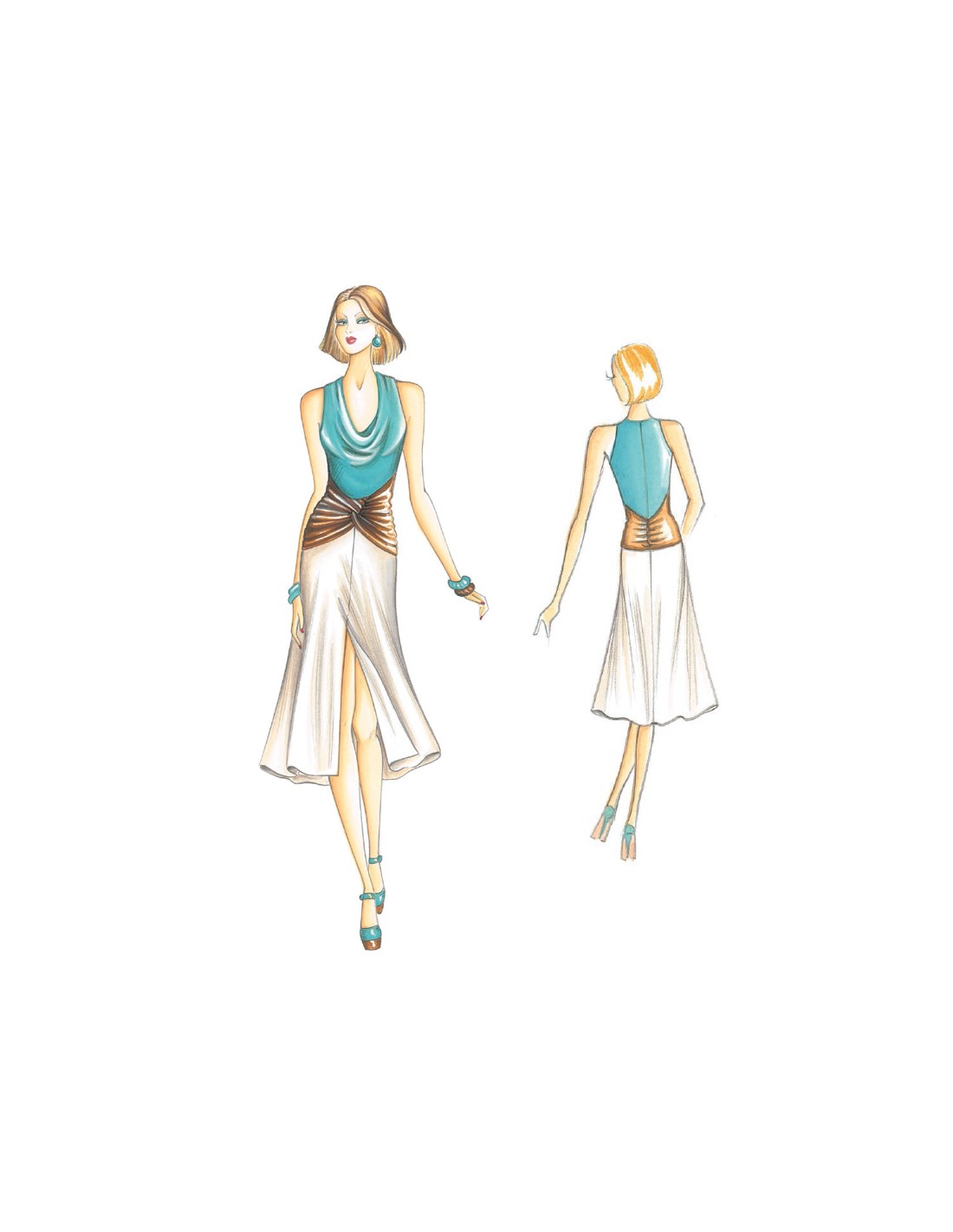 Trendy dress with cowl neck, draped sash with crossed bands and skirt made of four flared panels. Suggested fabric: viscose wool or other soft material.