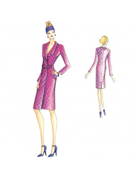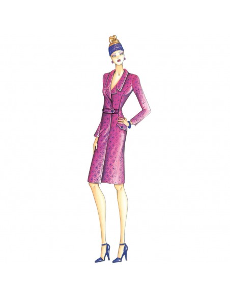 Zweireihiger Robe-Manteau mit kleinem durch zwei Knöpfe gehaltenen Gürtel. Empfohlen in geometrischem Stoffmustern.