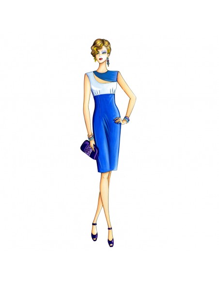 Ärmelloses Kleid in modellierter Linie mit Empire-Schnitt und zweiteiligem Mieder in Kontrastfarben, durchzogen mit abgerundetem Schlitz. Ausführbar in Krepp oder Duchesse-Atlas.