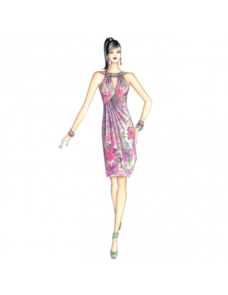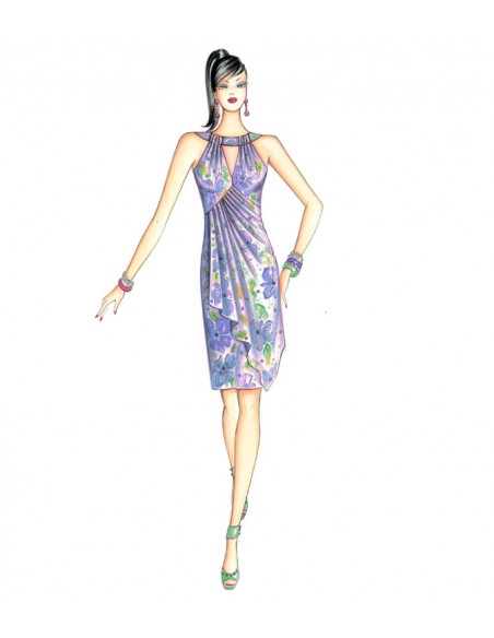 Gerade geschnittenes Kleid mit asymmetrischem Taschentuchmuster, aufgelockert durch eine weiche Drapierung, Top mit gekräuselten Besätzen, durch die eine Leiste geführt wird, die den Schiffchenausschnitt formt. Rücken mit eingezogener verlängerter Öffnung. Empfohlene Stoffe: Jersey, Satin, Musselin.