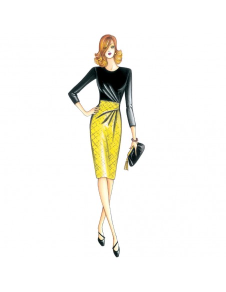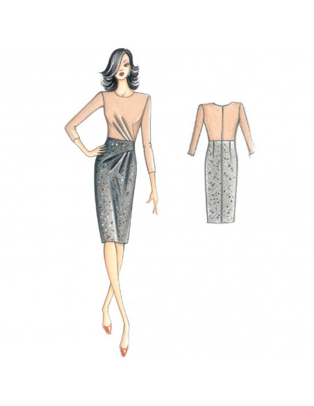 Sheath dress with draped bodice and skirt converging at one side of the waistline, crew neck, and ¾-length sleeves. Suggested fabric: two-tone or plain jersey, or crêpe.