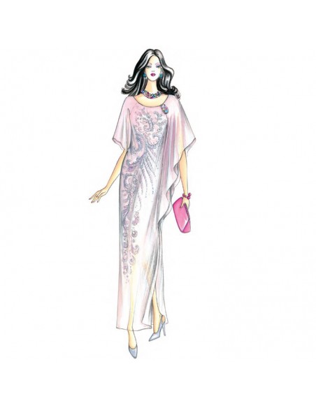 This tunic dress has raglan sleeves and a ruffled loose single side. Suggested fabric: chiffon, cady, crêpe de chine.