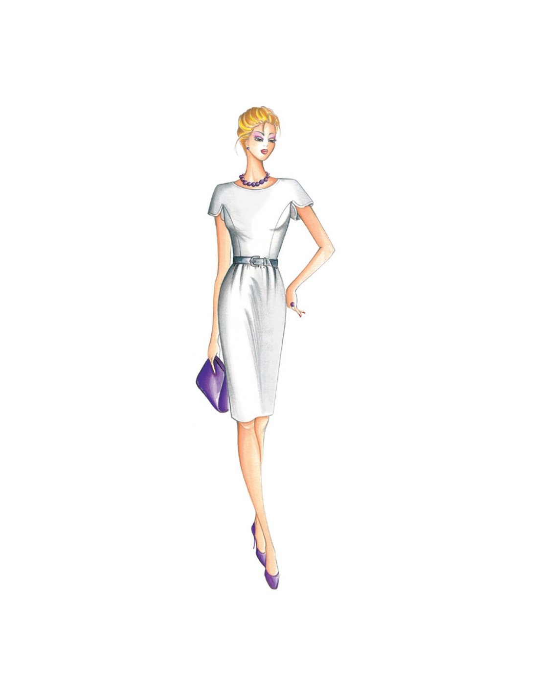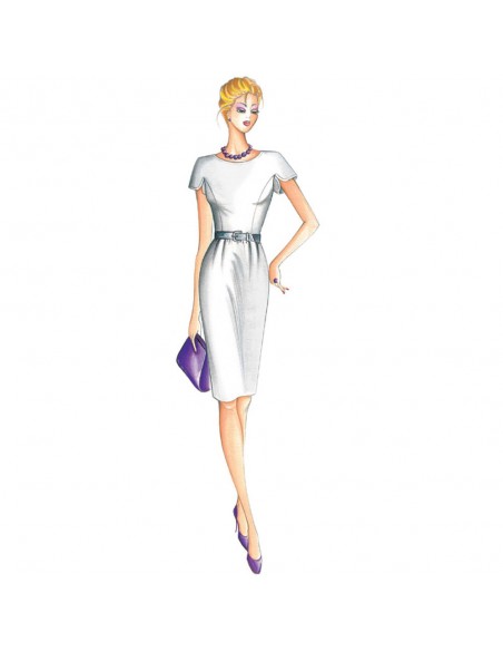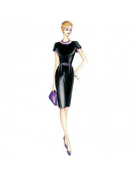 This dress has kimono sleeves with partial armholes and rounded slit, skirt with slight gathers at the waistline. Suggested fabric: crêpe, piquet, summer- weight wool.